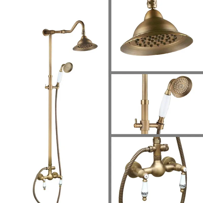 Antique Brass Wall Mounted Bathroom Rain Shower Faucet Shower Head Set Mixer Tap Dual Ceramic Handl