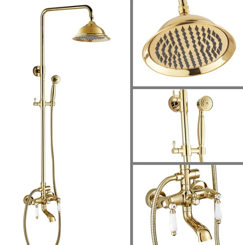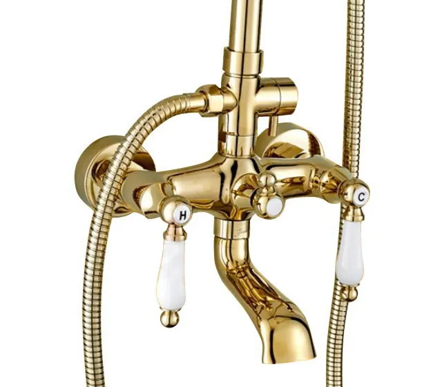 ORIGINAL Luxury Polished Gold Color Brass Dual Ceramic Handles Levers Bathroom Round Rainfall Shower Faucet