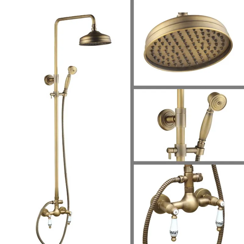 Antique Brass Wall Mounted Bathroom Rain Shower Faucet Shower Head Set Mixer Tap Dual Ceramic Handl
